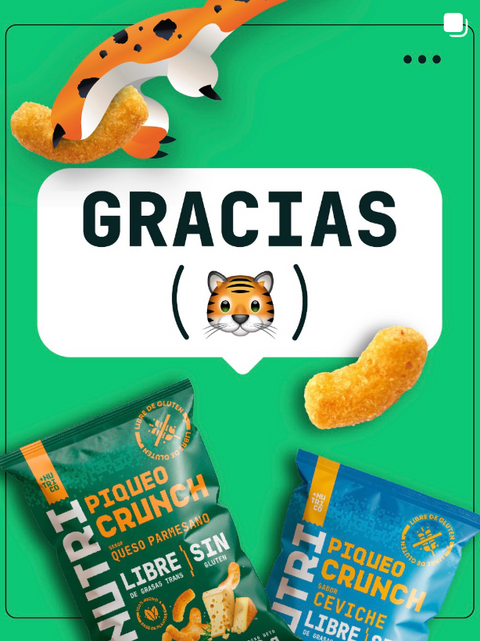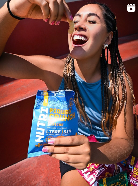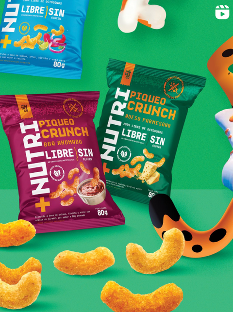Piqueos Crunch BBQ Ahumado: Snacks crujientes a base de quinua, arroz, kiwicha y yuca, con un irresistible sabor barbecue ahumado. Sin colesterol y con el toque perfecto de sal. El antojo saludable que no te juzga.